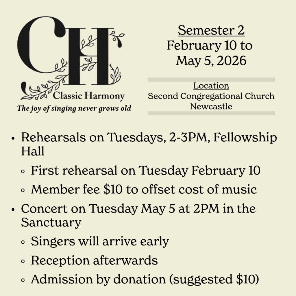 Classic Harmony welcomes seniors (that is, 55+) of all abilities, regardless of previous singing or musical experience (and if you’re under 55+ you are most welcome!). The goal is to keep voices energized and healthy while enjoying a positive social atmosphere. We choose from a wide variety of music including pop, gospel, Broadway tunes, folk songs and familiar selections from the Great American Songbook. Dues are just $10 per semester to offset the cost of music/materials.